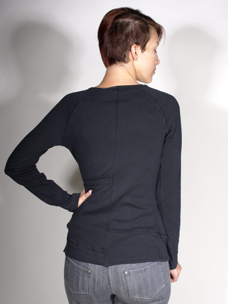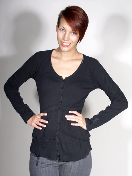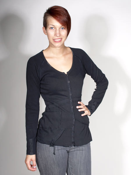 in anthra ist diese Shirtjacke von Yest, vorne durchgeknöpft, mit 2 aufgesetzten Taschen und Minipailletten an der Ausschnittblende. Länge der Shirtjacke ca. 64 cm.