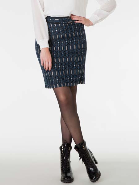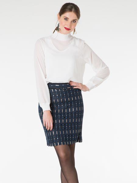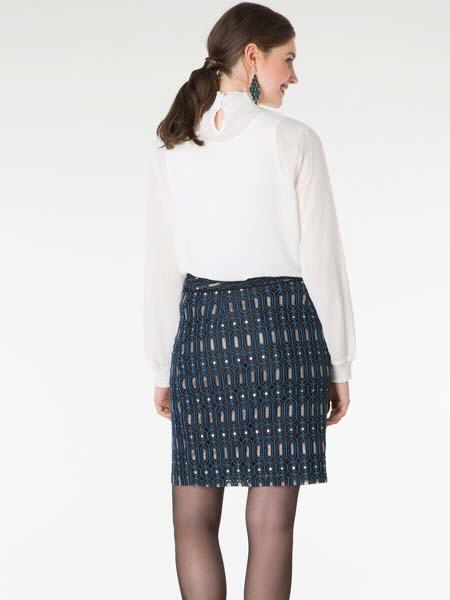 ist dieser schicke Rock von Yest, schwarz gefüttert und damit blickdicht. Er ist gerade geschnitten wie ein Bleistiftrock, hat einen festen Bund und wird seitlich mit RV geschlossen. Länge ca. 53 cm.