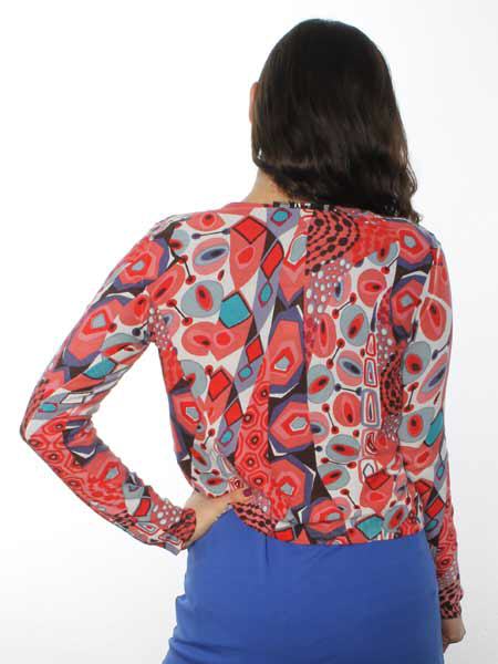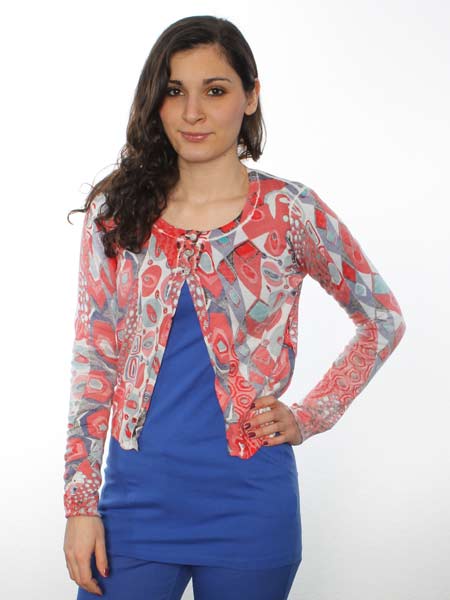 in rot/blau/wollweiß/hellblau/türkis ist diese Strickjacke von Yest. Sie ist taillenkurz, wird mit 3 Perlmuttknöpfen geschlossen, nach unten hin ist sie verschlußlos. Sie können die Jacke wenden und von beiden Seiten tragen, auf der einen Seite ist das Muster klar, auf der anderen leicht verwaschen. Länge der Strickjacke ca. 51 cm.