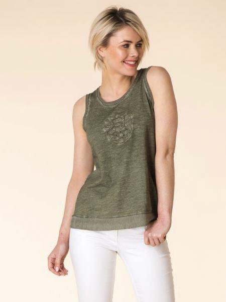 ist dieses Top von Yest gearbeitet. Die Saumkante und die Armausschnittkanten sind aus leicht transparentem Netzstoff. Das Vorderteil ist Ton-in-Ton bestickt mit einem Ornament. Länge ca. 66 cm.
