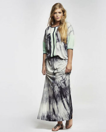 ist der Druck auf dem Jersey dieses Maxirockes von Maxima. Er ist leicht a-förmig geschnitten, hat Schlitze an den Seitennähten. Er hat an der Taille einen bequemen Gummidurchzug. Länge des Kleides ca. 104 cm.