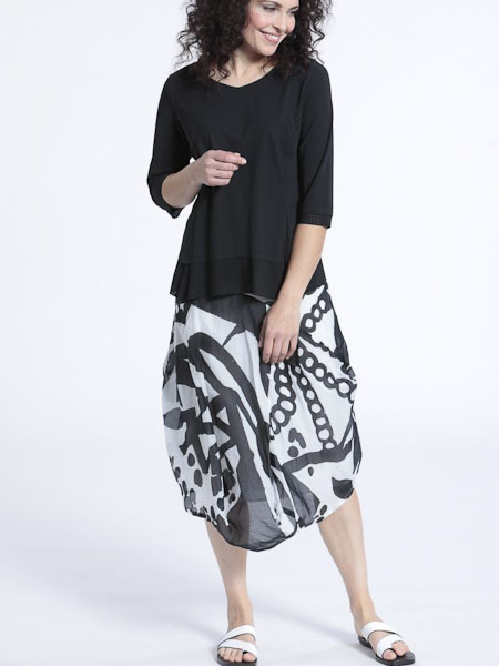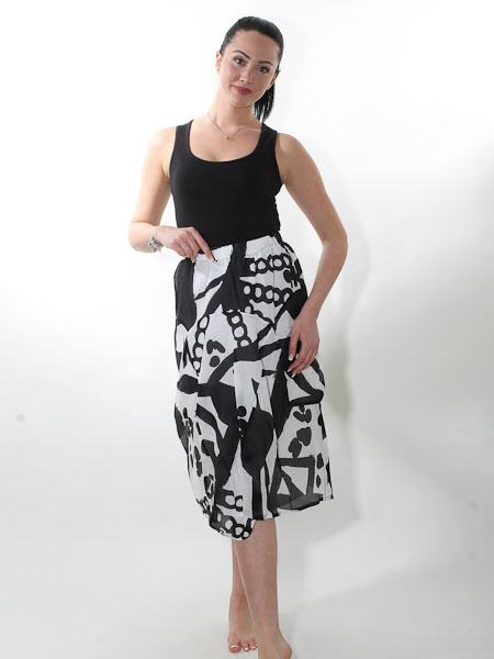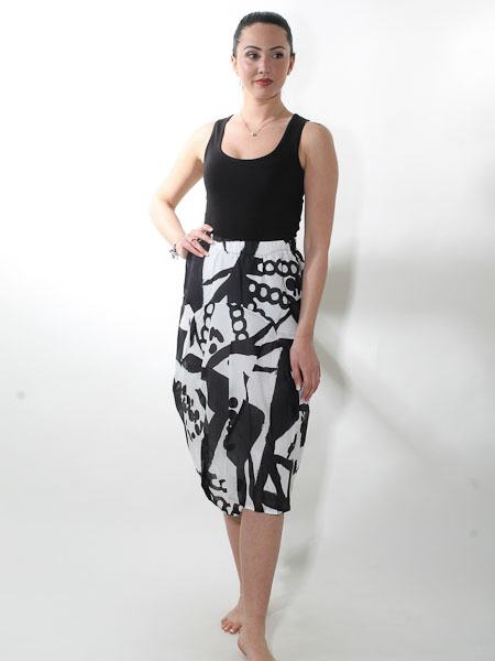 ist der Stoff aus Baumwolle/Seide bei diesem schicken Sommerrock von Vetono, der Stoff ist bedruckt in schwarz wollweiß, wie mit einem großen Pinsel. Er hat an der Taille einen bequemen Gummidurchzug. Er ist zum Saum hin ballonförmig geschnitten, leicht zipflig. Er ist gefüttert mit wollweißem Baumwoll-/Seidenstoff. Länge ca. 74 cm in Gr. II.