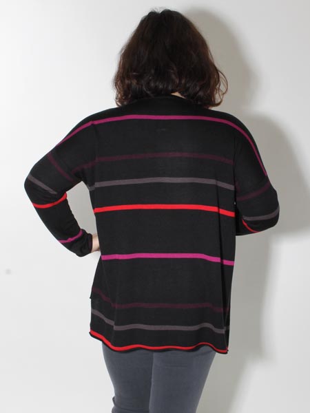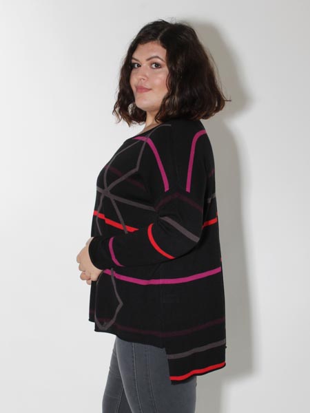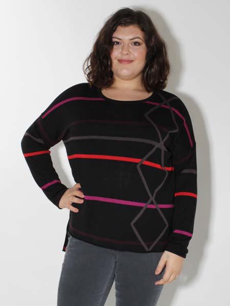 ist dieser Pulli von Doris Streich, schwarzgrundig mit Streifen und Rhomben in rot, grau, pink. Die Schultern sind überschnitten. Die Armel sind lang. Der lässige Pulli ist vorn kürzer als hinten, Länge in Gr. 46 vorn ca. 69 cm, hinten ca. 81 cm. Der Pulli fällt relativ weit aus. Er hat knappe Rollränder an allen Kanten.