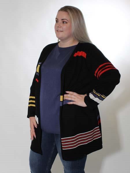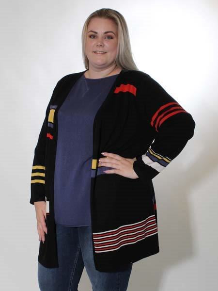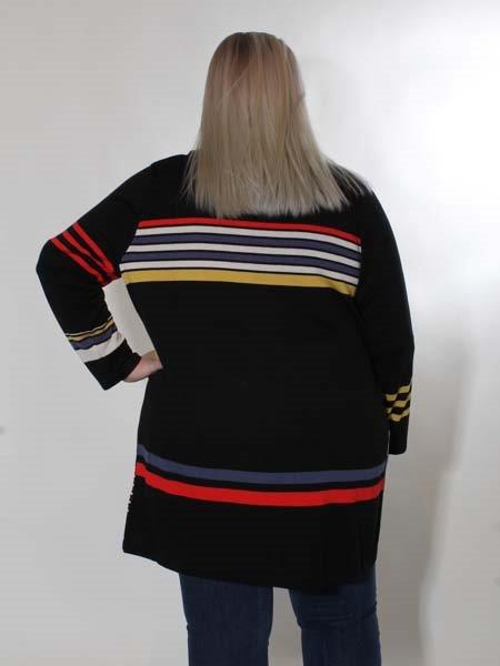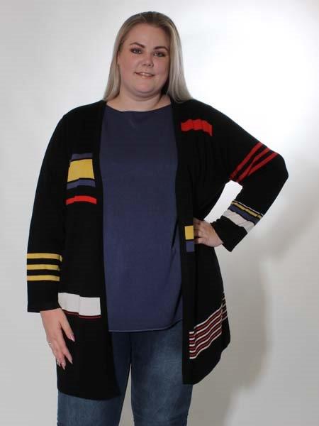 ist diese lässige Strickjacke von Doris Streich, schwarzgrundig, auf den Vorderteilen mit asymmetrisch angeordneten Streifen in rot, jeansblau, hellgelb. Länge ca. 92 cm in Gr. 50.