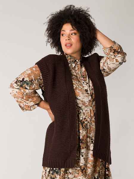 ist diese Strickweste von Yest, kraus rechts gestrickt, wir haben die Weste in dunkelbraun. Sie ist oversized geschnitten, kuschelig und bequem. Länge ca. 70 cm in Gr. 48.
