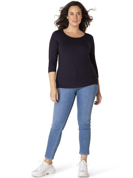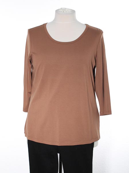 Unverzichtbar ist dieses Shirt von Yesta (Artikel Ace) bzw. von X-two (Artikel Venetian). Aus X-Two wurde Yesta, der Artikel ist derselbe. Das Shirt ist relativ kurz und kastig geschnitten, Länge ca. 64 cm, paßt deshalb gut zu weiten Röcken und Hosen. Es fällt relativ klein aus, wählen Sie eine Größe höher, damit sich nichts abzeichnet.