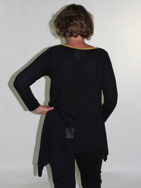 ist der asymetrische Halsausschnittes dieser Tunika von Mat aus leichtem Strickstoff, am Vorderteil bedruckt mit einem Schriftzug, umrahmt von aufgedruckten Rosen. Das Shirt ist A-förmig geschnitten, am Saum zipflig. Länge der Tunika an der Mitte ca. 75 cm, an den Seiten ca. 100 cm.
