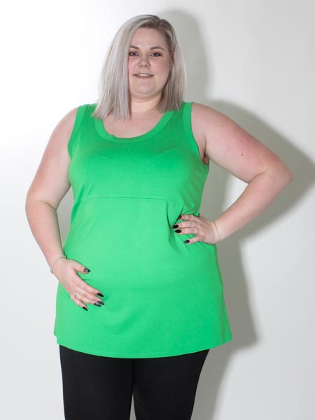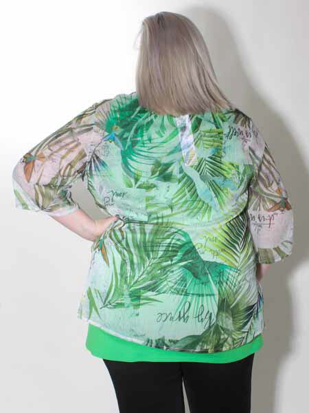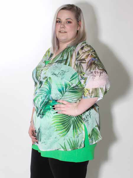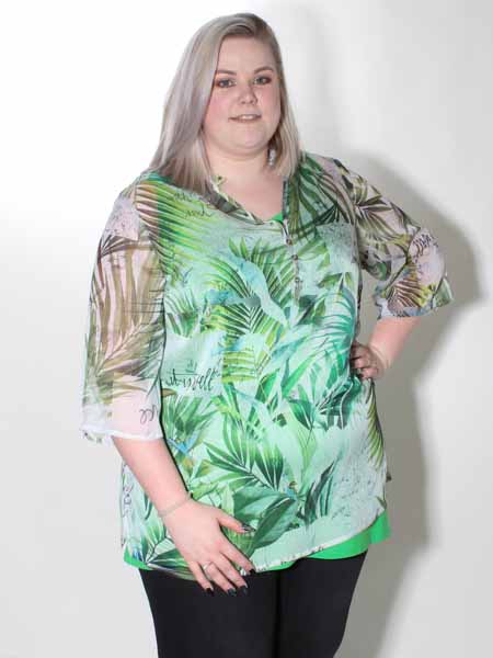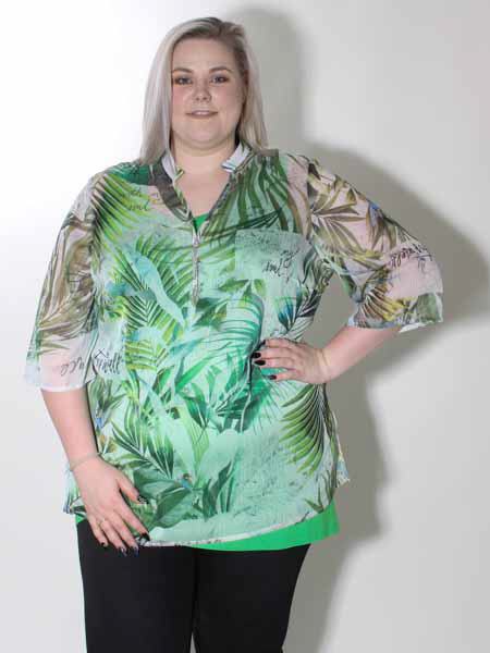 ist der Stoff dieser Bluse von Doris Streich, wunderschön bedruckt in Grüntönen mit Dschungelmotiven, Palmwedeln und Vögeln. Sie können Tops oder ärmellose Kleider darunter tragen, sehr variabel. Wir haben ein grünes Top passend darunter im Angebot. Länge der Bluse ca. 83 cm.