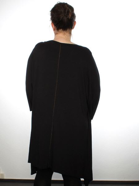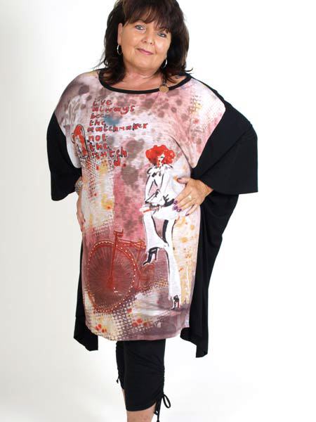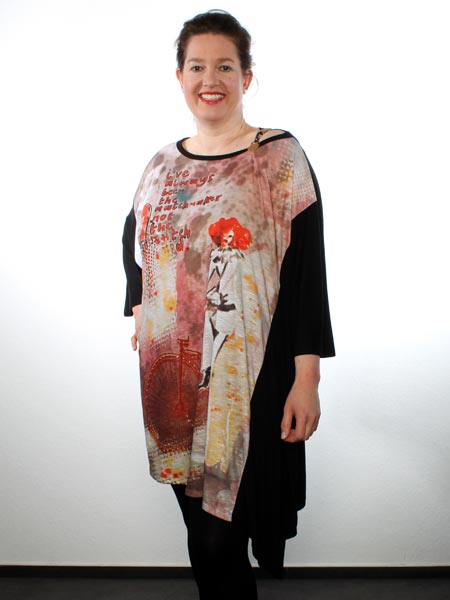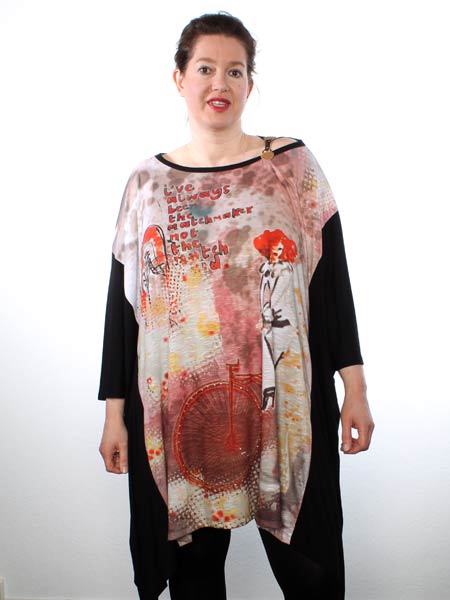 hat dieses Bigshirt von Mat, in Aquarell bedruckt, das Fahrrad ist mit glitzernden Steinchen geschmückt. Keck ist der Riegel an der linken Schulter, aus Lederimitat und Karabinerhaken. Länge an der Mitte ca. 95 cm, an den Seiten etwas länger.