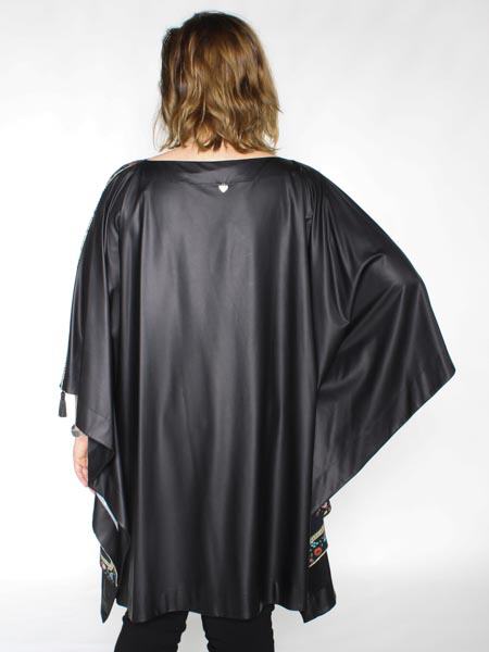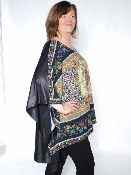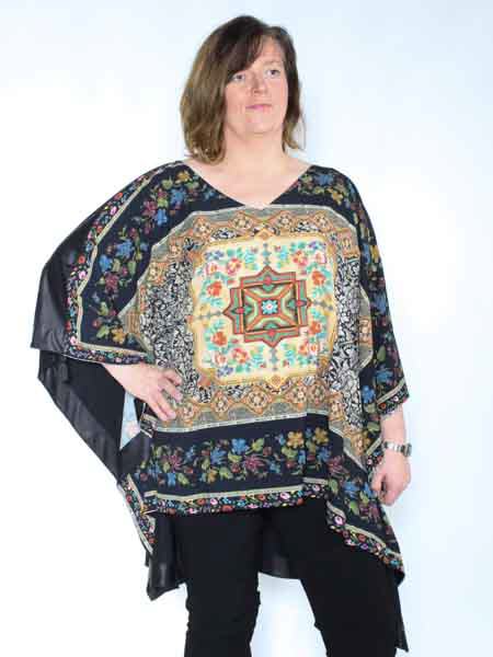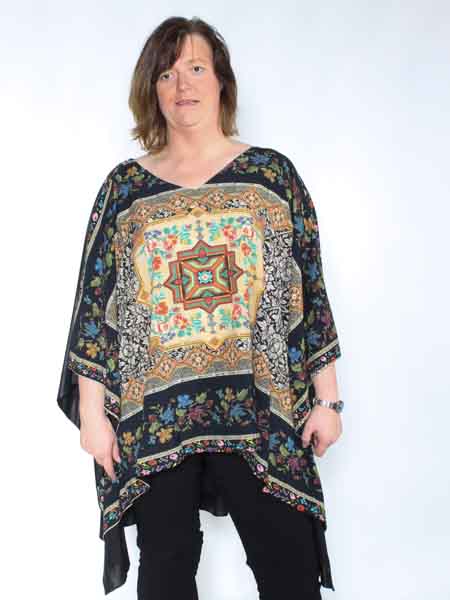 geschnitten, mit Fledermausärmeln, ist diese schicke Tunika von Mat. Das Vorderteil ist bedruckt mit dem Muster einer Gobelinstickerei in warmen Farben. Das Rückenteil ist länger und leicht glänzendem uni Stoff. Länge der Tunika am Vorderteil ca. 77 cm, am Rückenteil ca. 99 cm.