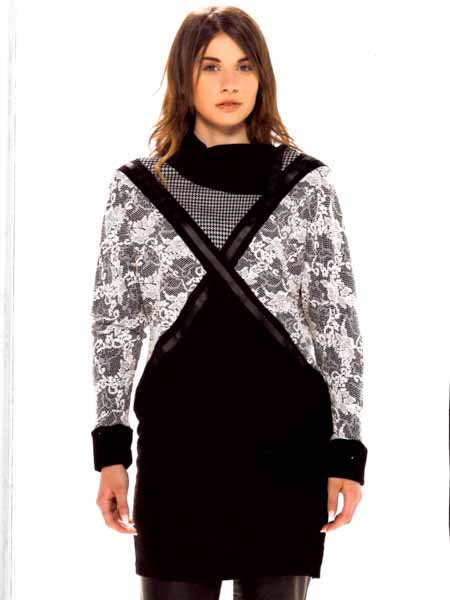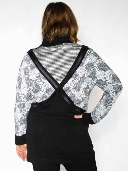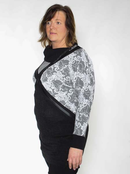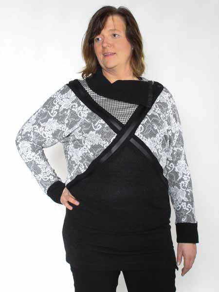 zusammengesetzt ist diese Tunika von Mat, aus schwarzem Jersey, im Spitzenmuster und Hahnentrittmuster, alle Stoffe sind elastisch. Die Diagonalen an Vorder- und Rückenteil sind mit schwarzen Kunstlederstreifen betont. Der Kragen ist aus Rippenjersey, Sie können ihn als Rolli oder aufgeknöpft an der Schulter asymetrisch offen tragen. Die Tunika ist an der linken Seitennaht unten aufknöpfbar. Länge der Tunika ca. 97 cm, Sie können sie auch unten schoppen und kürzer tragen.