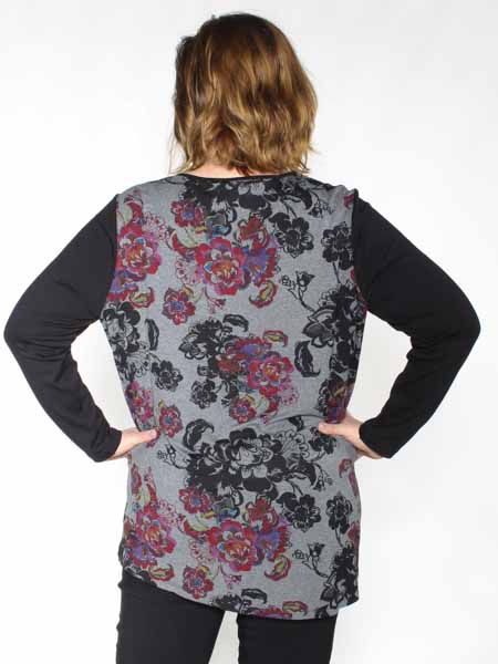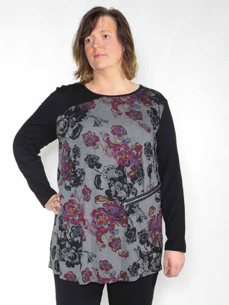 sind Vorder- und Rückenteil bei dieser schicken Tunika von Maxima, in Beerentönen und schwarz auf graumelange. Die Ärmel und die asymetrische Passe sind aus schwarzem Jersey. Das Vorderteil ist unter dem applizierten Reißverschluß gerafft. Länge ca. 77 - 84 cm.
