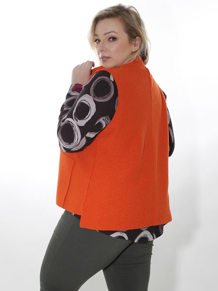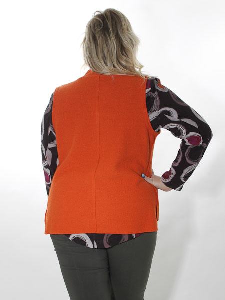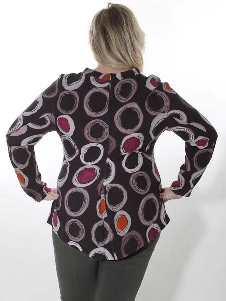 hat diese Bluse von Vetono, aus einem braunen Webstoff, bedruckt wie handbemalt mit Kreisen und Kringeln in den Farben grau, schlamm, rost, aubergine. Sie wird am Rückenteil mit Zipper geschlossen. Sie ist vorn am Saum gerade und kürzer als hinten. Der Saum am Rückenteil ist gerundet und hat ab Taille nach unten hin eine aufspringende Falte. Länge vorn ca. 70 cm in Gr. IV, hinten ca. 80 cm.