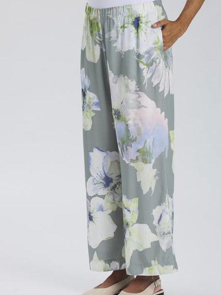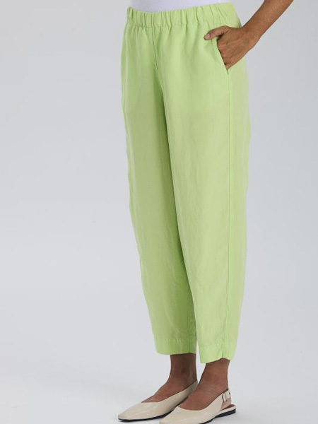 Passend zur grünen Bluse haben wir eine bedruckte Marlenehose und eine Leinenhose.