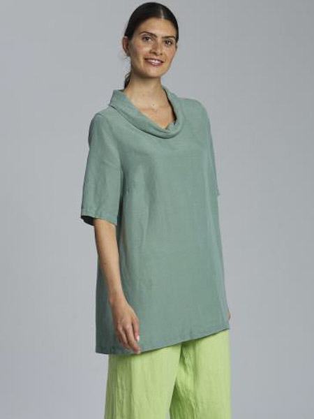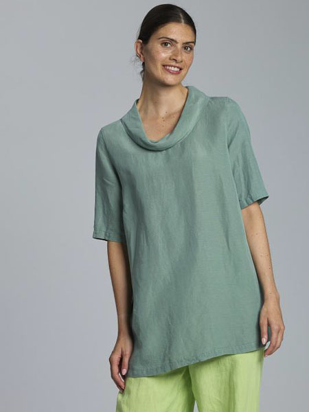 haben wir diese Bluse von Vetono, aus einem Webstoff aus Leinen mit Lyocell. Sie hat einen halsfernen Kragen. Sie ist A-förmig geschnitten. Das Rückenteil ist etwas länger als das Vorderteil, an der hinteren Mitte hat sie einen Schlitz. Länge vorn ca. 71 cm, hinten ca. 73 cm in Gr. II.