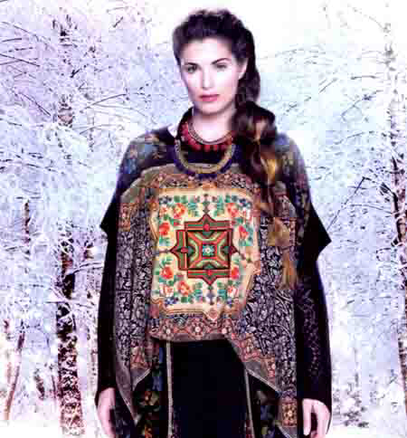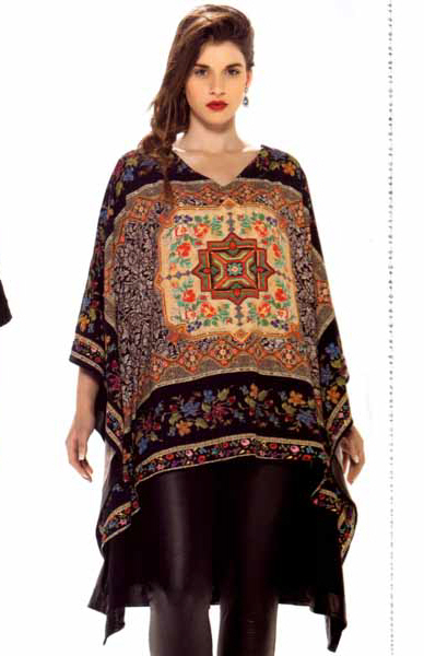 geschnitten, mit Fledermausärmeln, ist diese schicke Tunika von Mat. Das Vorderteil ist bedruckt mit dem Muster einer Gobelinstickerei in warmen Farben. Das Rückenteil ist länger und leicht glänzendem uni Stoff. Länge der Tunika am Vorderteil ca. 77 cm, am Rückenteil ca. 99 cm.