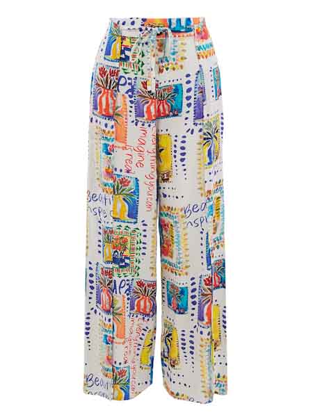 ist die Malerin des Gemäldes, mit dem der Webstoff aus Viscose/Leinen dieser lässigen Hose von Dolcezza bedruckt ist, Kunst und Mode aus Kanada. Sie hat weite Hosenbeine wie eine Marlenehose. Der 4 cm hohe Taillenbund hat an der hintern Hose einen breiten Gummidurchzug, superbequem. Die Stoffbänder zum Knoten sind nur Zierde an der vorderen Hose. Die vorderen Hosenbeine haben an der Mitte einen Schlitz ab Kniehöhe. Innere Beinlänge ca. 80 cm. Länge incl. Bund in Gr. M ca. 104 cm.