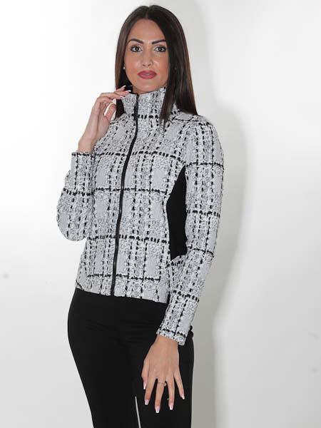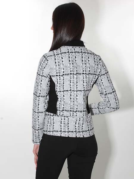 ist dieses sportlich elegante Jacke von Dolcezza, Kunst und Mode aus Kanada. Sie ist gearbeitet aus einem strukturiertem schwarz/weiß/grauem elastischem Stoff und einem schwarzen Rippenjersey. Sie hat einen hohen Stehkragen, innen uni schwarz. Sie wird mit einem Reißverschluß geschlossen. Die schwarzen Partien an den Seitennähten zaubern eine tolle Figur. Länge in Gr. S ca. 59 cm.