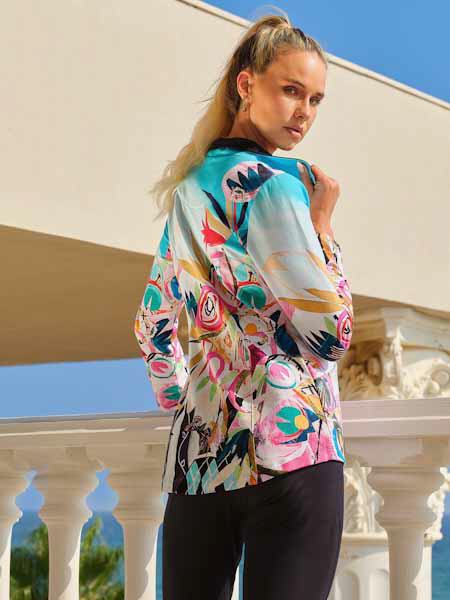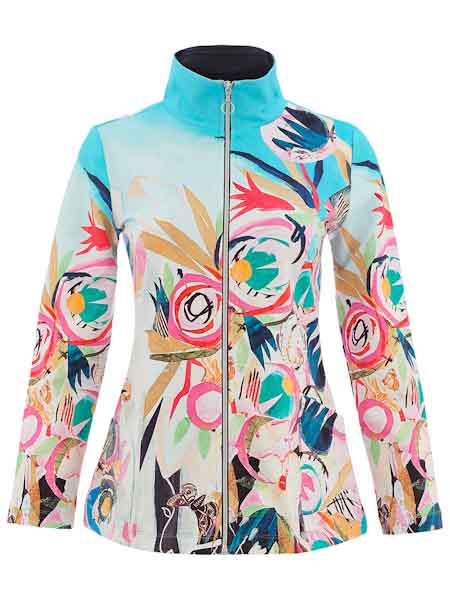 ist die Malerin des Gemäldes, mit dem der etwas festere Baumwolljersey dieser Jacke von Dolcezza bedruckt ist, Kunst und Mode aus Kanada. Sie hat einen Stehkragen, innen uni dunkelblau. Sie wird vorn mit einem silbernen Zipper geschlossen. Sie hat lange Ärmel. Auf den Vorderteilen sind 2 Taschen. Die lässige Jacke ist tailliert, vorn etwas kürzer als hinten. Länge in Gr. M vorn ca. 67 cm und hinten ca. 75 cm.