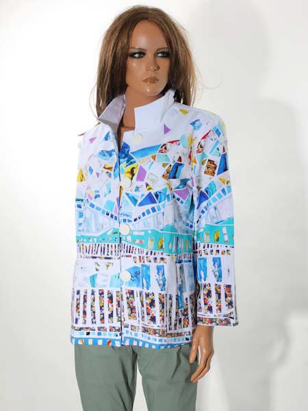 ist die Malerin des Gemäldes, mit dem der etwas dickere Baumwolljersey dieser Jacke von Dolcezza bedruckt ist, Kunst und Mode aus Kanada. Die Jacke hat einen hohen Stehkragen, wird vorn mit großen weißen Knöpfen und Schlaufen geschlossen. Sie ist leicht oversized geschnitten, etwas tailliert. Die Jacke hat 2 senkrechte Eingrifftaschen. Die Ärmel sind 7/8 lang. Länge in Gr. M ca. 65 cm.