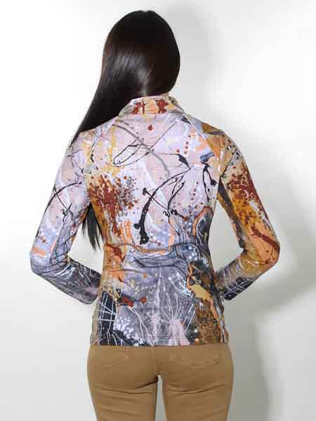 ist die Kunstmalerin des Gemäldes, mit dem der etwas dickere elastische Baumwolljersey bei dieser längeren Jacke von Dolcezza bedruckt ist, Kunst und Mode aus Kanada. Sie hat einen Stehkragen, wird mit Metallreißverschluß geschlossen. Sie hat 2 Taschen auf den Vorderteilen. Die schicke Jacke ist gut tailliert. Länge in Gr. S ca. 66 cm.