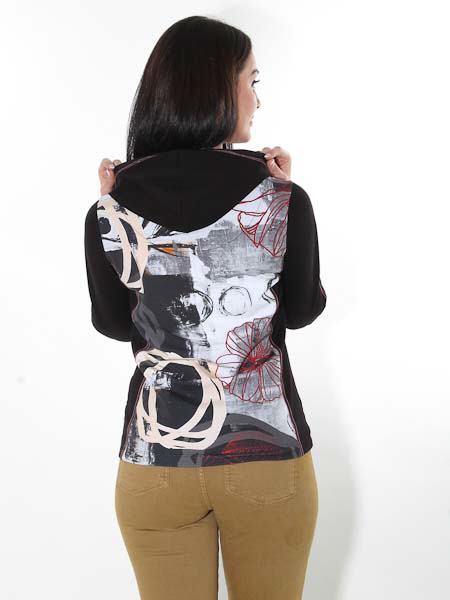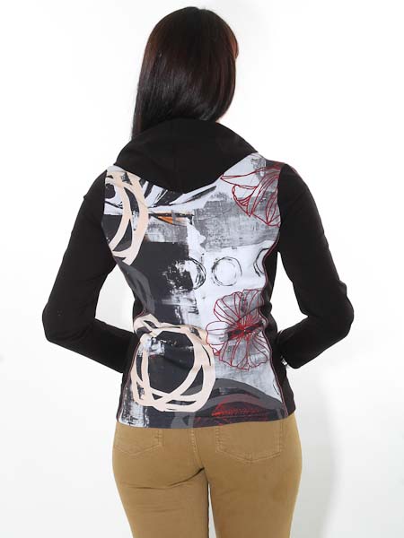 ist die Malerin des Gemäldes, mit dem der etwas dickere Baumwolljersey an Vorder- und Rückenteil dieser Jacke von Dolcezza, Kunst und Mode aus Kanada, bedruckt ist. Sanfte Farben wollweiß, hellgrau, schwarz, camel und ein wenig terracotta, kombiniert mit uni schwarz. Die Jacke wird an der vorderen Mitte mit silbernem Metallzipper geschlossen. Die Kapuze läßt sich in der Weite mit Bändern zusammenziehen. In den Teilungsnähten sind 2 Taschen versteckt. Viele Nähte und die senkrechte Mitte der Ärmel sind betont mit dunkelroten Kettenähten. Länge der Kapuzenjacke in Gr. S ca. 64 cm.