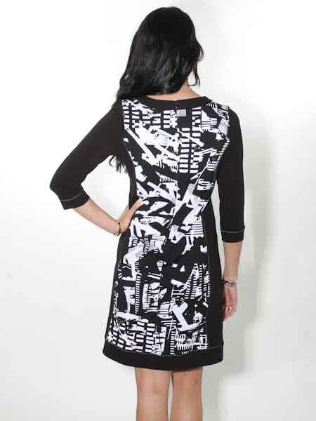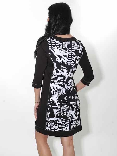 ist die Kunstmalerin des Gemäldes, mit dem der Viscosejersey an Vorder- und Rückentteil dieses Kleides von Dolcezza bedruckt ist, Kunst und Mode aus Kanada. Die 3/4 langen Ärmel sind aus schwarzen Jersey. Die seitlichen Partien von Vorder- und Rückenteil sind auch aus schwarzem Jersey, das zaubert eine tolle Figur. Die schwarze Ausschnittblende ist betont mit schwarzen Glassteinchen. Länge des Kleides in Gr. S ca. 98 cm.