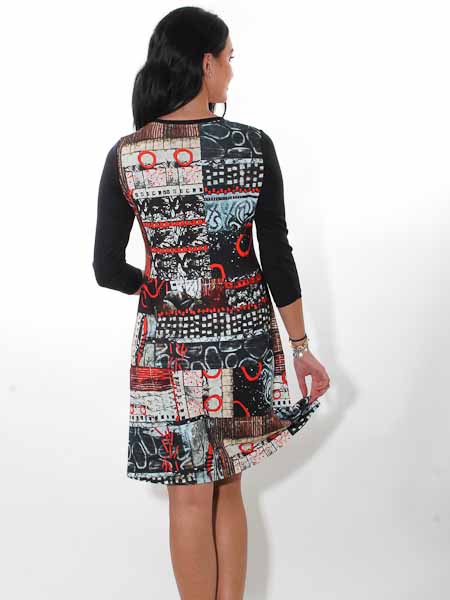 mit dem Gemälde "Rising up" der Kunstmalerin Laura Lein-Svenener ist der etwas dickere Jersey an Vorder- und Rückenteil bei diesem schönen Kleid von Dolcezza, Kunst und Mode aus Kanada. Die Ausschnittkante ist betont mit einer schwarzen Kante aus schwarzem Netzstoff. Die 3/4 langen Ärmel sind aus schwarzem Jersey. Das Kleid ist tailliert, ab Taille springen 2 Falten nach unten auf, so dass das Kleid leicht ausgestellt ist am Saum. Länge in Gr. M ca. 105 cm, in Gr. XXL ca. 108 cm