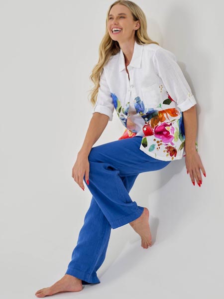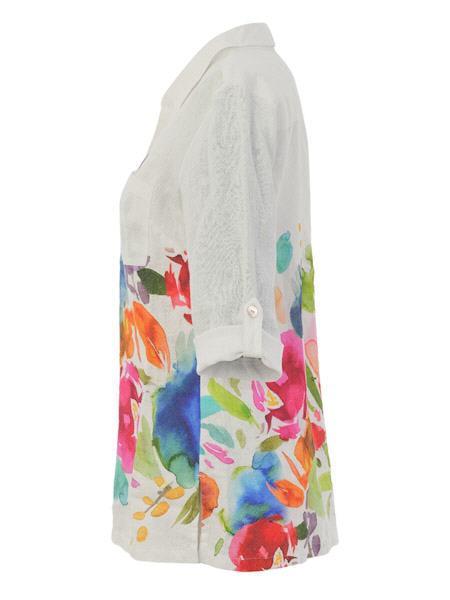 ist die Malerin des schönen Gemäldes, mit dem der weiße Leinenstoff dieser langen Bluse von Dolcezza bedruckt ist, Kunst und Mode aus Kanada, farbintensives Acquarell mit großen Blumen auf uni weiß. Sie hat einen Hemdblusenkragen, ist vorn durchgeknöpft mit Perlmuttknöpfen. Die Ärmel sind 3/4 lang, sie können mit Riegel und Knopf gekürzt werden auf 3/4 Länge. Die Bluse ist leicht tailliert, sie hat kurze Schlitze. Sie können sie auch gut als Sommerjacke über Tops oder wie auf dem Foto tragen. Länge in Gr. M ca. 75 cm.