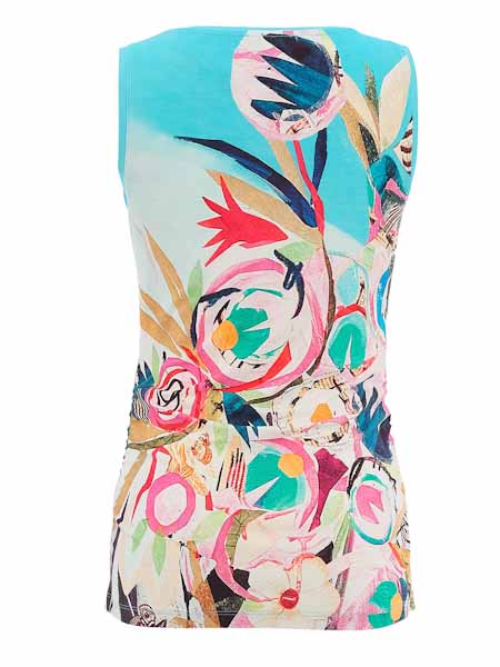 ist die Malerin des Gemäldes, mit dem der Viscosejersey dieses Tops von Dolcezza bedruckt ist, Kunst und Mode aus Kanada. Es hat einen flachen Halsausschnitt. Die Ausschnittblenden an Hals- und Armausschnitten sind uni türkis. Der obere Part des Vorderteils ist betont mit transparenten aufgebügelten Steinchen. Das Top ist leicht tailliert. An den Seitennähten ist ein Gummi durchgezogen, damit können Sie das Top in der Länge raffen. Länge in Gr. L ca. 68 cm an der vorderen Mitte.