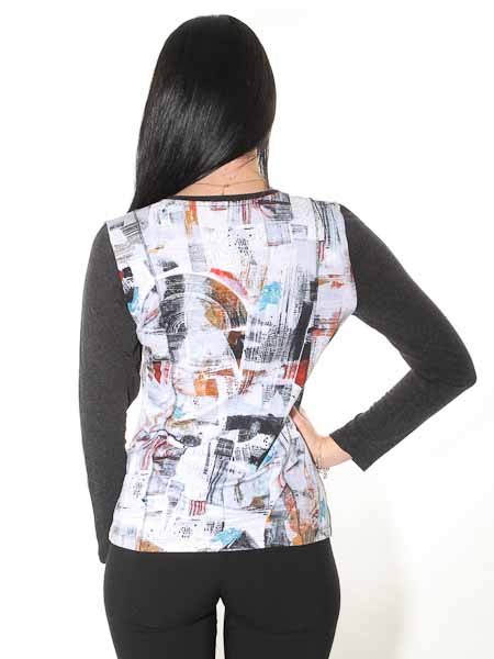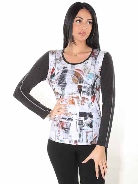ist der Maler des Gemäldes, mit dem der Viscosejersey dieses Shirts von Dolcezza am Vorder- und Rückenteil bedruckt ist, Kunst und Mode aus Kanada. Die langen Ärmel und die Ausschnittblende sind schwarzmelange. Auf der Ausschnittblende sind kleine kupferfarbene Nieten. Das Shirt ist leicht tailliert. Die senkrechte Mitte der Ärmel ist verziert mit einer silbergrauen Kettelnaht. Länge in Gr. S ca. 65 cm.