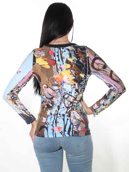 ist der Maler des Gemäldes, mit dem der Viscosejersey dieses Shirts von Dolcezza bedruckt ist, Kunst und Mode aus Kanada. Es hat einen runden Halsausschnitt, darunter einen kurzen V-Ausschnitt und eine Knopfleiste mit kupferfarbenen Knöpfchen. Die Ausschnittblende und die senkrechte Mitte der Ärmel sind schwarzmelange. Das Shirt ist leicht tailliert. Länge in Gr. S ca. 68 cm.