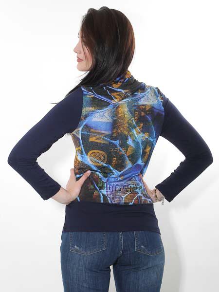 ist die Malerin des Gemäldes, mit dem der Viscosejersey von Dolcezza, Kunst und Mode aus Kanada, an Vorder- und Rückenteil sowie am Kragen bedruckt ist. Der doppelte halsferne Kragen fällt weich. Die Ärmel und die breite Saumkante sind dunkelblau. Die senkrechte Mitte der Ärmel sind mit kupferfarbenen Kettelnähten betont. Länge in Gr. S ca. 67 cm.