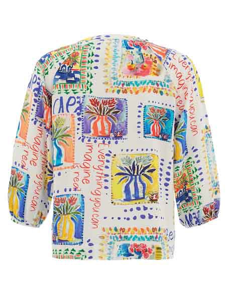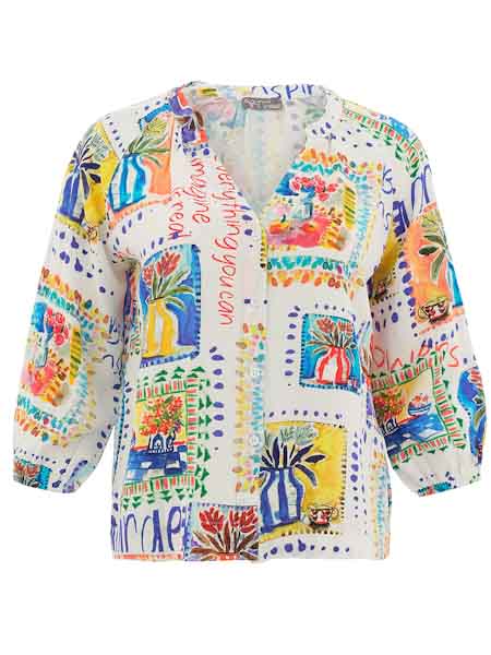 ist die Malerin des Gemäldes, mit dem der Webstoff aus Viscose/Leinen dieser lässigen Bluse von Dolcezza bedruckt ist, Kunst und Mode aus Kanada. Sie hat einen runden Halsausschnitt, darunter einen V-Ausschnitt. Sie ist vorn durchgeknöpft mit kleinen weißen Knöpfen. Die Raglanärmel sind 3/4 lang. Der Ärmelabschluß hat einen elastischen Gummidurchzug. Sie ist oversized und kastig geschnitten, wählen Sie im Zweifel eine Größe kleiner. Länge in Gr. L ca. 60 cm.