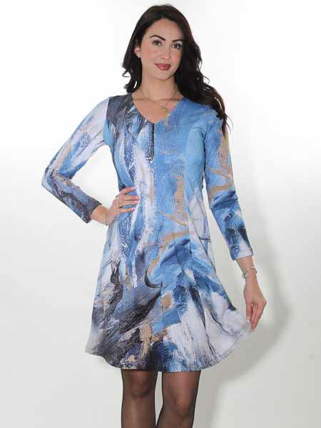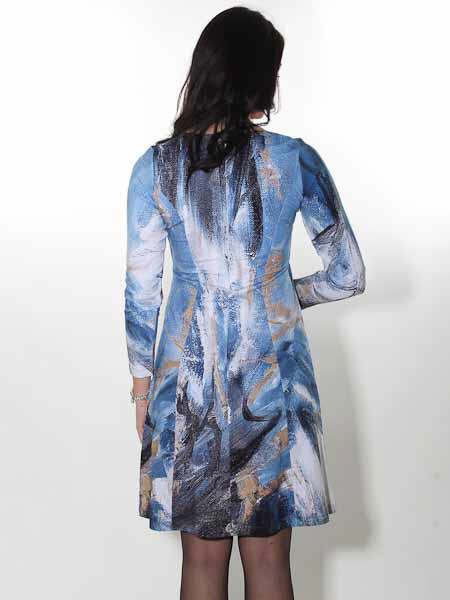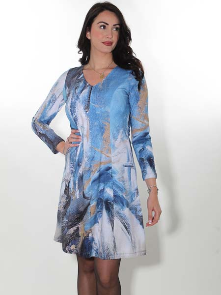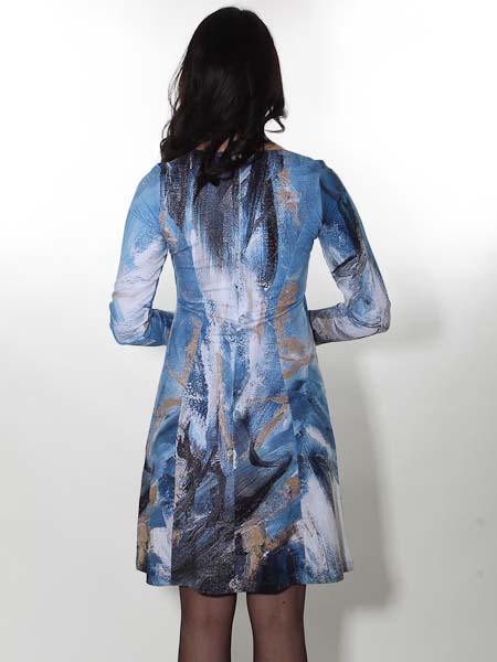 ist die Malerin des Gemäldes, mit dem der etwas dickere Baumwolljersey dieses Kleides von Dolcezza bedruckt ist. Es hat einen V-Ausschnitt, wird an der hinteren Mitte mit einem Reißverschluß geschlossen. Das Kleid ist bis Taillenhöhe an Vorder- und Rückenteil gefüttert. Das Kleid ist tailliert, zum Saum hin ausgestellt. Länge in Gr. M ca. 98 cm.
