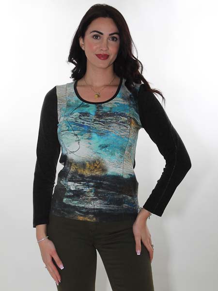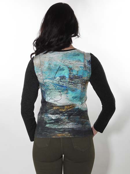 ist die Malerin des Gemäldes, mit dem der Viscosejersey an Vorder- und Rückenteil dieses Shirts von Dolcezza bedruckt ist. Die Teilungsnähte sind betont mit kupferfarbenen Kettelnähten. Die Ärmel sind anthrazithmelange. Die senkrechte Mitte der Ärmel ist betont mit einer kupferfarbenen Kettelnaht. Die Halsblende ist anthrazithmelange. Das Shirt ist leicht tailliert. Länge in Gr. S ca. 64 cm.