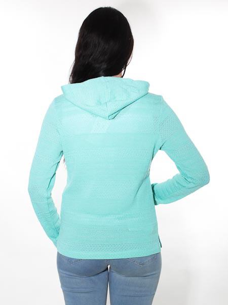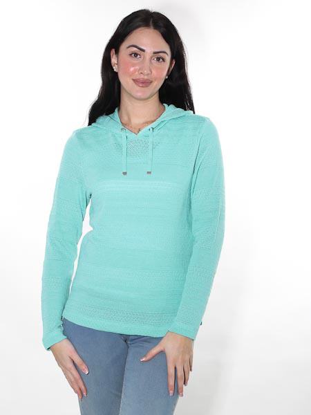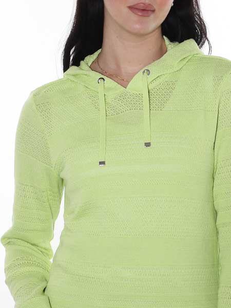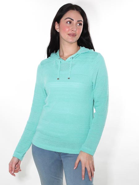 ist das Thema, zu dem dieser Kapuzenpulli von Dolcezza gehört, Kunst und Mode aus Kanada. Wir haben ihn in den Farben citrus und acqua. Er ist in verschiedenen Strukturmustern gestrickt. Die Kapuze hat durchgezogene Strickbänder. Der Pulli ist gerade geschnitten, hat kurze Schlitze in den Seitennähten. Länge in Gr. S ca. 68 cm.