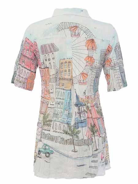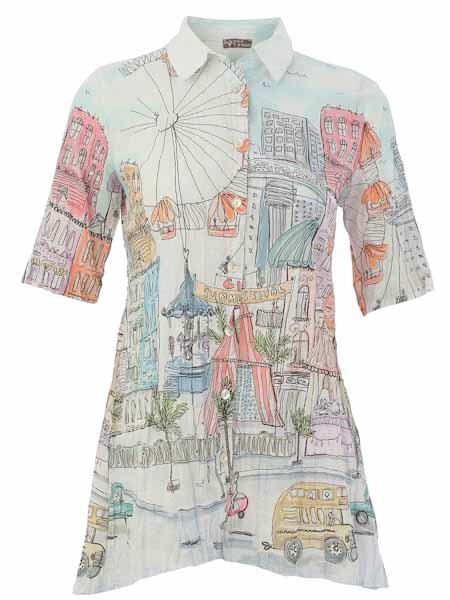 ist die Malerin des Gemäldes, mit dem der gecrashte Baumwollwebstoff dieser langen Bluse von Dolcezza bedruckt ist, Kunst und Mode aus Kanada. Sie hat einen Hemdblusenkragen, ist an der vorderen Mitte durchgeknöpft mit Perlmuttknöpfen. Die Ärmel reichen bis zum Ellbogen. Die Bluse ist leicht tailliert, zum Saum hin etwas ausgestellt. Die Bluse ist vorn kürzer als hinten, die Saumkanten sind gerundet. Länge in Gr. S ca. 72 cm vorn und ca. 80 vm hinten.