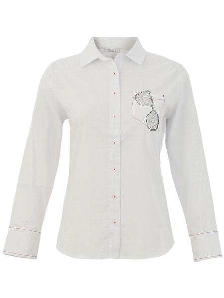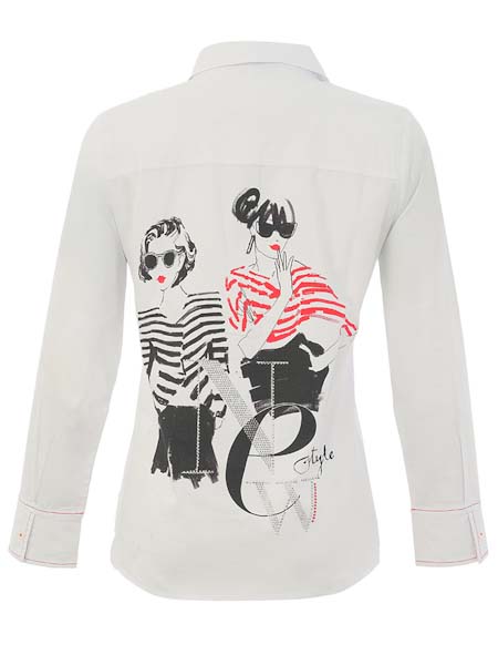 ist das Thema, zu dem diese weiße Bluse von Dolcezza gehört. Sie hat einen Hemdblusenkragen, ist vorn durchgeknöpft mit weißen Knöpfchen. Die Brusttasche ist in rot aufgesteppt, die Sonnenbrille ist geformt aus aufgebügelten schwarzen und silbernen Steinchen. Das Rückenteil ist bedruckt mit Motiven aus der Modewelt, einige Buchstaben sind geformt aus silbernen Steinchen. Die langen Ärmel haben Manschetten mit Knopfverschluß. Sie sind rot abgesteppt. Die Saumkanten sind gerundet. Länge in Gr. S ca. 67 cm.