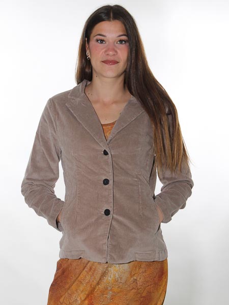 ist das Thema, zu dem diese Cordjacke von Dolcezza, Kunst und Mode aus Kanada gehört. Wir haben sie in der Farbe taupe sand. Sie ist geschnitten wie ein Blazer mit Reverskragen. Sie wird mit 3 schwarzen Knöpfen geschlossen. Sie hat 2 Tascheneingriffe in den senkrechten Teilungsnähten. Sie ist leicht tailliert. Länge in Gr. S ca. 62 cm. Die Jacke ist innen am Rückenteil gefüttert mit einem bedruckten Webstoff, ein Motiv von Kush Navid.