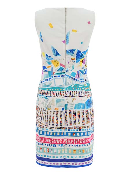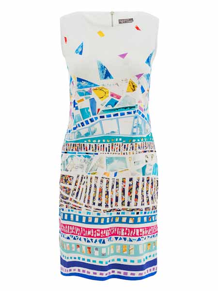ist die Malerin des Gemäldes, mit dem der Baumwolljersey dieses sommerlichen Kleides von Dolcezza bedruckt ist, Kunst und Mode aus Kanada. Es hat einen runden Halsausschnitt, wird an der hinteren Mitte mit einem silbernen Zipper geschlossen. Das Kleid ist tailliert, zum Saum hin gerade geschnitten. Länge in Gr. S ca. 92 cm.