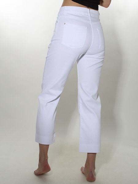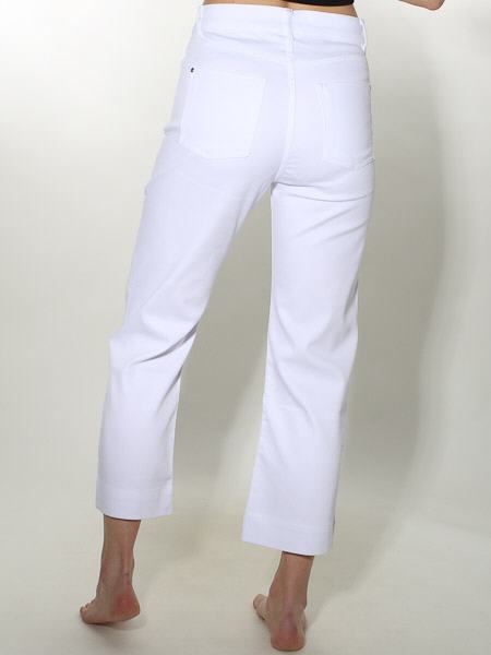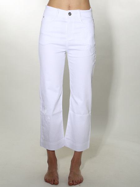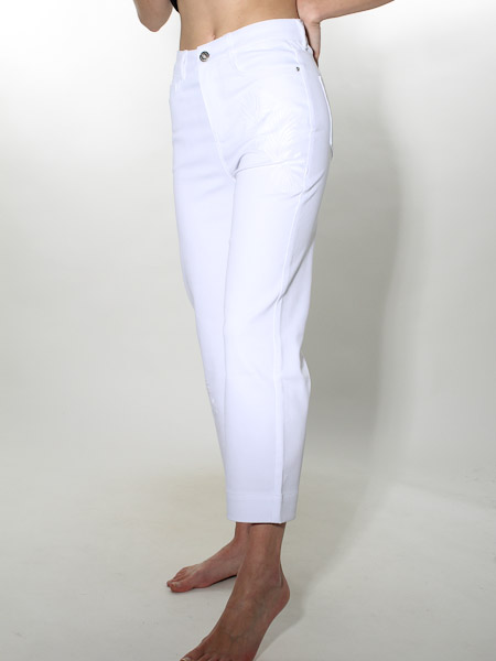 ist das Thema, zu dem diese Hose aus weißem Denimstoff von Dolcezza gehört, Kunst und Mode aus Kanada, high waist. Sie wird mit Metallknopf und Reißverschluß geschlossen. Sie hat vorn 2 Eingrifftaschen, hinten 2 aufgesetzte Potaschen. Der Polyesteranteil im Stoff macht sie angenehm weich. Sie 7/8 lang. Das linke Hosenbein ist oben und das rechte Hosenbein ist unten bestickt mit weißen Gräsern. Länge incl. Bund in Gr. XS ca. 92 cm. 1/2 Saumweite = 21 cm.