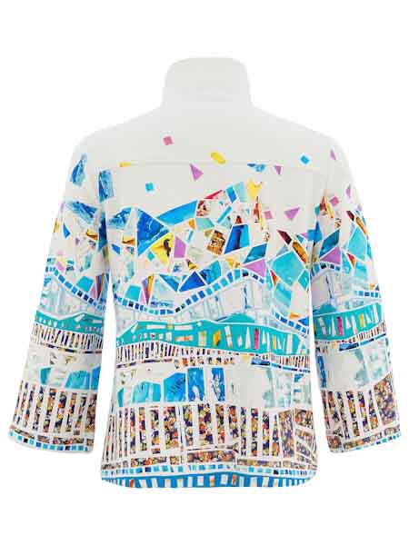 ist die Malerin des Gemäldes, mit dem der etwas dickere Baumwolljersey dieser Jacke von Dolcezza bedruckt ist, Kunst und Mode aus Kanada. Die Jacke hat einen hohen Stehkragen, wird vorn mit großen weißen Knöpfen und Schlaufen geschlossen. Sie ist leicht oversized geschnitten, etwas tailliert. Die Jacke hat 2 senkrechte Eingrifftaschen. Die Ärmel sind 7/8 lang. Länge in Gr. S ca. 65 cm.