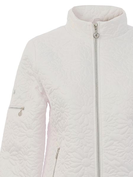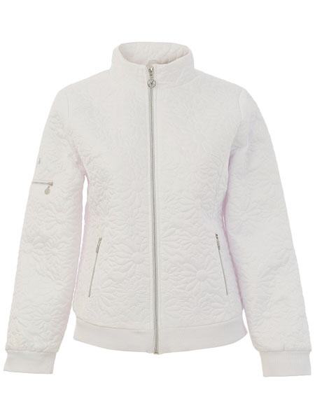 ist das Thema, zu dem diese sportliche Jacke von Dolcezza gehört. Sie ist am Vorderteil aus einem weißen, in Blütenform abgesteppten Stoff, der leicht wattiert ist. Die Jacke hat einen hohen Stehkragen. Sie wird vorn mit einem silbernen Reißverschluß geschlossen. In den senkrechten Teilungsnähten sind 2 Taschen mit Zipper. Am rechten Ärmel ist eine Tasche mit Zipper. Die Abschlußbündchen an Vorder- und Rückenteil sowie an den Ärmeln sind in Rippe gestrickt. Länge in Gr. S ca. 60 cm.