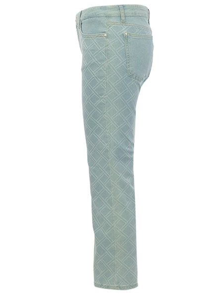 geschnitten ist diese hellblaue 5-pockets-Jeans von Dolcezza, Kunst und Mode aus Kanada, stonewashed. Sie ist hinten hoch geschnitten, ist 7/8 lang. Der Denim ist herrlich weich und elastisch. Der Denim ist an den vorderen und hinteren Beinen hellgrau mit Rhomben bedruck. Der Taillenbund, die Passe und die Potaschen sind nicht bedruckt. Die Hosenbeine sind gerade geschnitten mit einer 1/ Saumweite von 21 cm. Innere Beinlänge 67 cm, Länge incl. Bund in Gr. S ca. 90 cm.