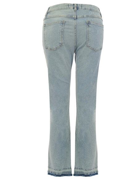 geschnitten ist diese hellblaublaue, light blue, 5-pockets-Jeans von Dolcezza, Kunst und Mode aus Kanada, stonewashed. Sie ist hinten hoch geschnitten, ist 7/8 lang. Der Denim ist herrlich weich und elastisch. Die vorderen Hosenbeine sind Ton-in-Ton bestickt mit einem Schriftzug, mit Blumenmotiven und mit Herzchen, zusätzlich betont mit aufgebügelten silbernen Steinchen. Der Saum hat offene geschnittene Stoffkanten. Die Hosenbeine sind schmal, zum Saum hin etwas ausgestellt mit einer 1/ Saumweite von 22 cm. Innere Beinlänge 66 cm, Länge incl. Bund in Gr. S ca. 90 cm.
