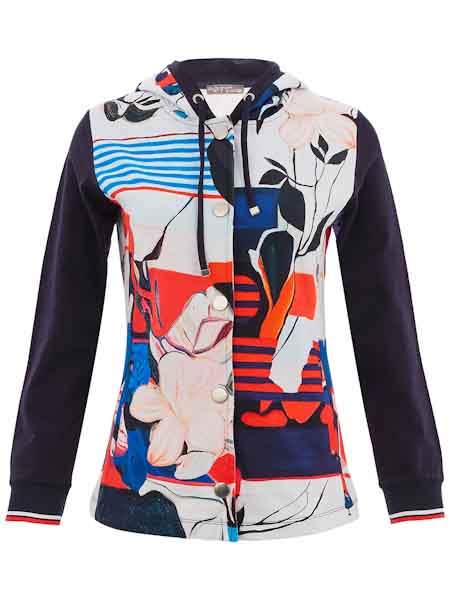 ist die Malerin des Gemäldes, mit dem der etwas dickere Baumwolljersey dieser sportlichen Jacke von Dolcezza bedruckt ist an Vorder- und Rückenteil sowie an der großen Kapuze, Kunst und Mode aus Kanada. Die langen Ärmel sind uni blau, haben als Abschluß Rippenbündchen gestreift in dunkelblau, rot und weiß. Die Kapuze ist dunkelblau gefüttert. Die Weite der Kapuze können Sie mit blauen Bändern raffen. Die Jacke wird vorn geschlossen mit 2 silbernen Druckknöpfen. Sie ist tailliert, hat senkrechte Teilungsnähte, hat 2 Taschen in den Teilungsnähten. Länge in Gr. S ca. 67 cm.