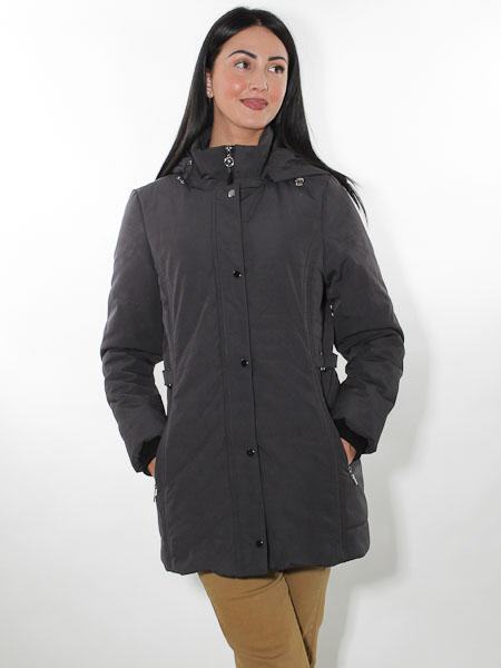 ist diese stahlgraue Jacke von Dolcezza, Kunst und Mode aus Kanada. Sie hat eine große Kapuze, die sie mit einem Reißverschluß abtrennen können. Die Weite der Kapuze läßt sich mit Bändern verstellen. Die lange Jacke wird mit einem Zipper und zusätzlich mit dunkelgrauen Druckknöpfen geschlossen. Auf den Vorderteilen hat sie 2 senkrechte RV-Taschen. In Die Winterjacke ist dick wattiert, das Innenfutter ist uni stahlgrau. In Taillenhöhe ist sie 3 x quer abgesteppt. Die Weite der Taille können Sie mit einem Band und Druckknöpfen verändern. Unter den wattierten Ärmeln hat sie als Abschluß Manschetten aus Rippenjersey. Länge der Winterjacke in Gr. S ca. 86 cm.