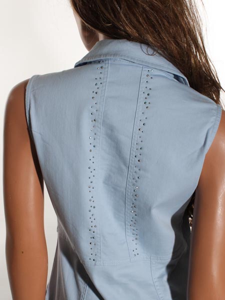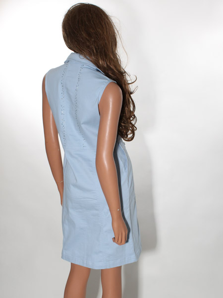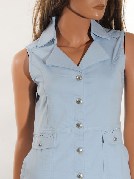 ist das Thema, zu dem dieses Kleid von Dolcezza gehört. Wir haben es in der Farbe koralle und in hellblau vorrätig, es ist aus einem Jeansstoff Denim gearbeitet. Das Kleid hat einen Reverskragen, ist an der vorderen Mitte durchgeknöpft mit geprägten silbernen Knöpfen. Es ist in Bahnen geschnitten, gut tailliert, zum Saum hin gerade wie ein Etuikleid. Es hat 2 bequeme Taschen, die Patten sind betont mit silbernen Steinchen. Länge in Gr. S ca. 92 cm.