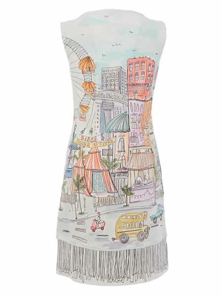 ist die Malerin des Gemäldes, mit dem der etwas dickere Baumwolljersey dieses Kleides von Dolcezza bedruckt ist, Kunst und Mode aus Kanada. Es hat einen runden Halsausschnitt, an der vorderen Mitte einen kurzen silbernen Metallreißverschluß. Es ist leicht tailliert, zum Saum hin ein wenig ausgestellt. In den Teilungsnähten sind 2 Taschen versteckt. Länge in Gr. S ca. 96 cm.